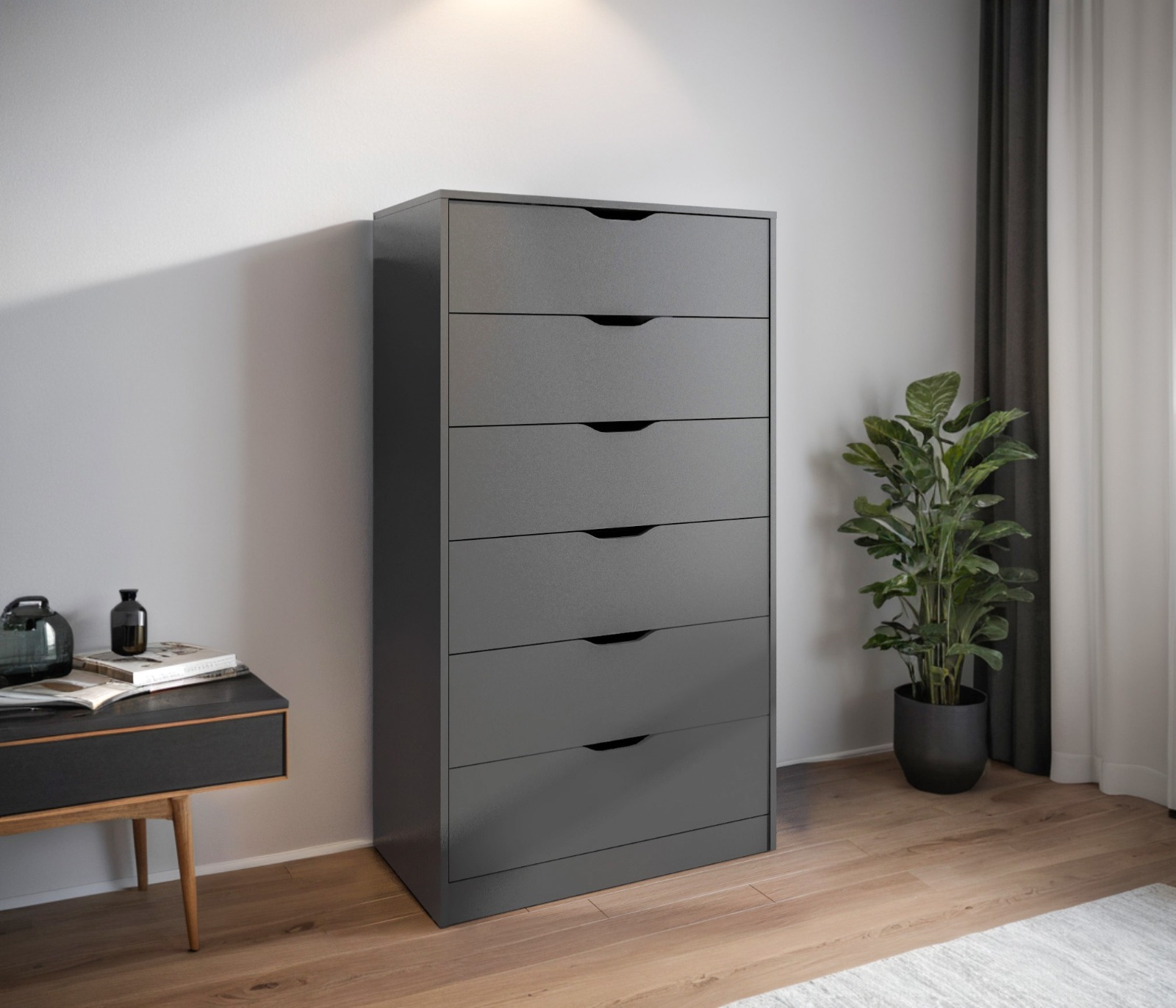 Комод оснащён шестью вместительными ящиками, с шариковыми направляющими. Ящики обеспечивают достаточно места для хранения одежды, белья или других личных вещей. Поверхность комода устойчива к загрязнениям и легко очищается, что позволяет сохранить его безупречный вид с минимальными усилиями.