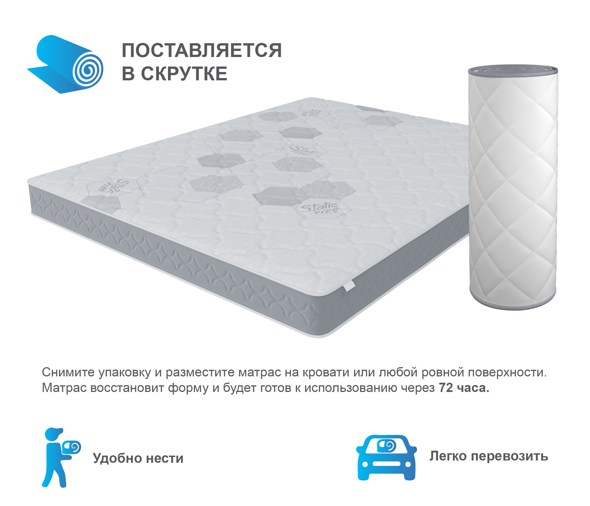 Для сохранения свойств и внешнего вида матраса, а также для разительного увеличения срока службы матраса рекомендуем использование матрас с защитным чехлом АкваСтоп. Любой матрас отвечает за правильность положения во время сна лишь нижнего и среднего отделов позвоночника, а за шейный отдел отвечает правильно подобранная ортопедическая подушка.