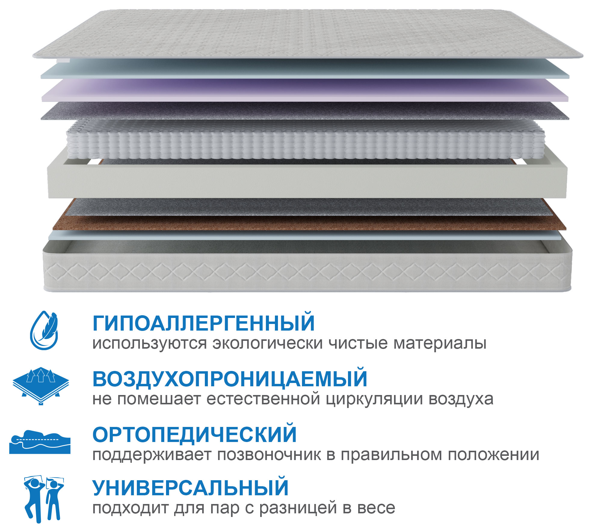Данная модель сочетает в себе все компоненты, которые позволяют быть матрасу поистине комфортным и универсальным. Блок независимых пружин обеспечивает правильную поддержку позвоночнику и гарантирует расслабление мышц во время сна. Натуральный латекс, который используется в качестве комфортного слоя одной из сторон- считается премиальным наполнительным, который обладает уникальным сочетанием жесткости, упругости и долговечности. Вторая сторона матраса не много жестче, ведь там вместо латекса- латексированный кокосовый лист, который распределяет нагрузку по блоку пружин и придает матрасу необходимую жесткость. Чехол выполнен из плотного жаккарда, в составе, которого не менее 60% хлопка, а стегается он на 15 мм пене, что придает матрасу мягкость, при этом узор стежки подобран таким образом, что его поверхность обладает тем же эффектом микромассажа, что и ячеистые пены. Обращаем ваше внимание на то, что любой матрас отвечает за правильность положения во время сна нижнего и среднего отделов позвоночника, а за правильность положения шейного отдела отвечает правильно подобранная ортопедическая подушка. Рекомендуем использование с защитным чехлом AquaStop.  |