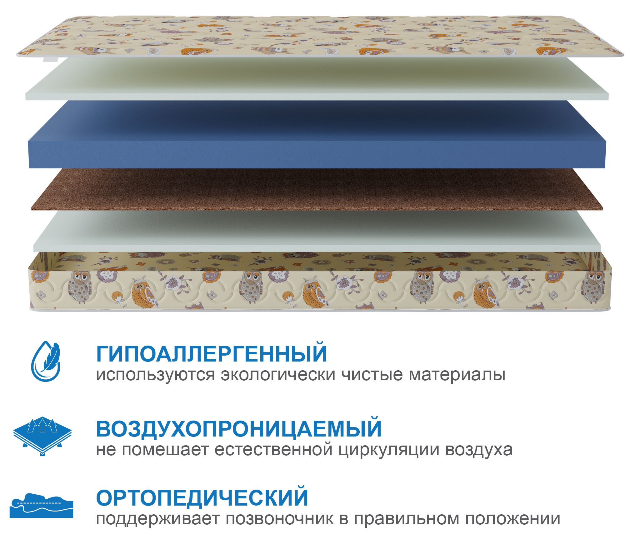Легкий, прочный, удобный матрас, который подойдет для всех деток. Чехол- 100% Хлопок.Рекомендовано использование с защитным чехлом Аквастоп.  |